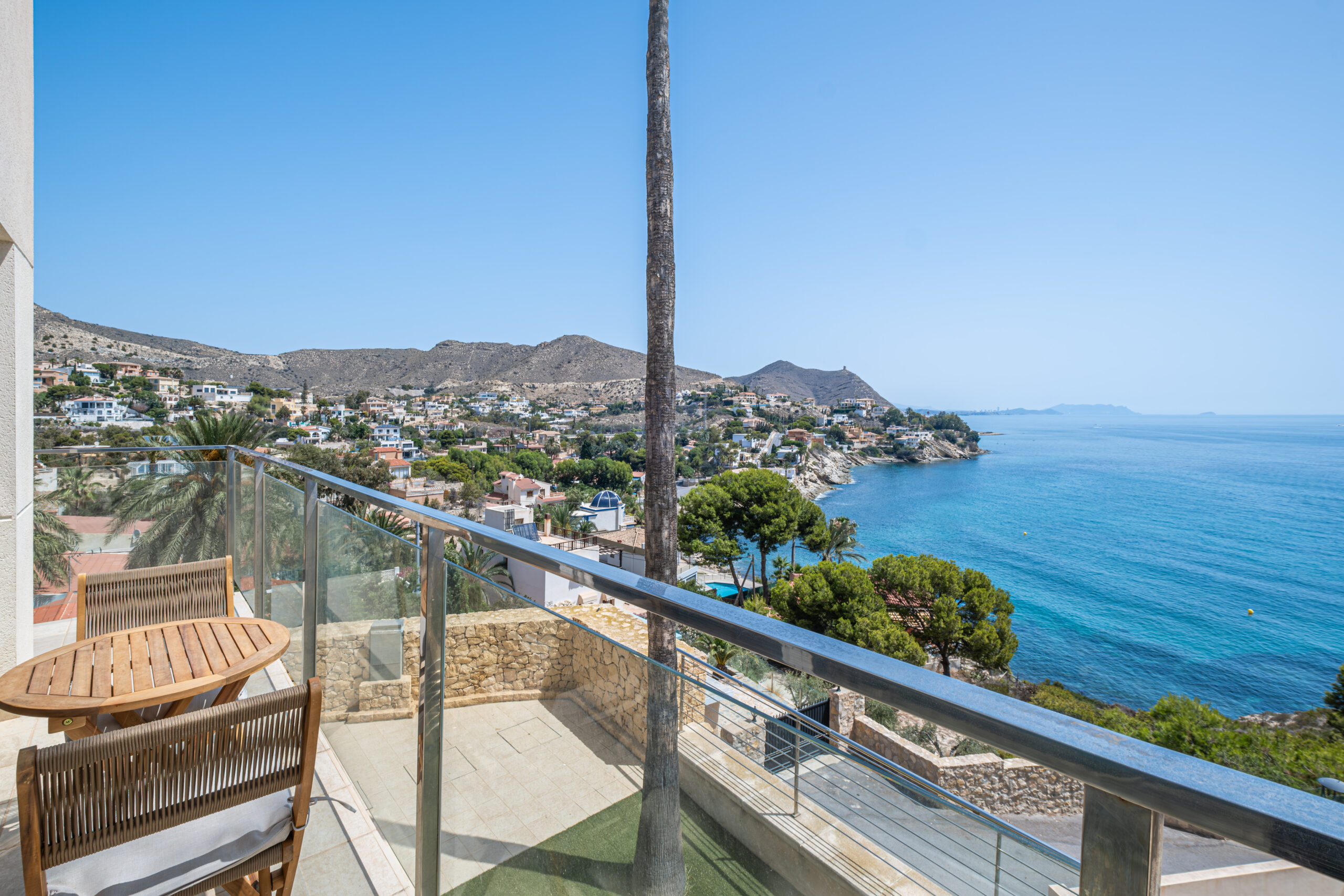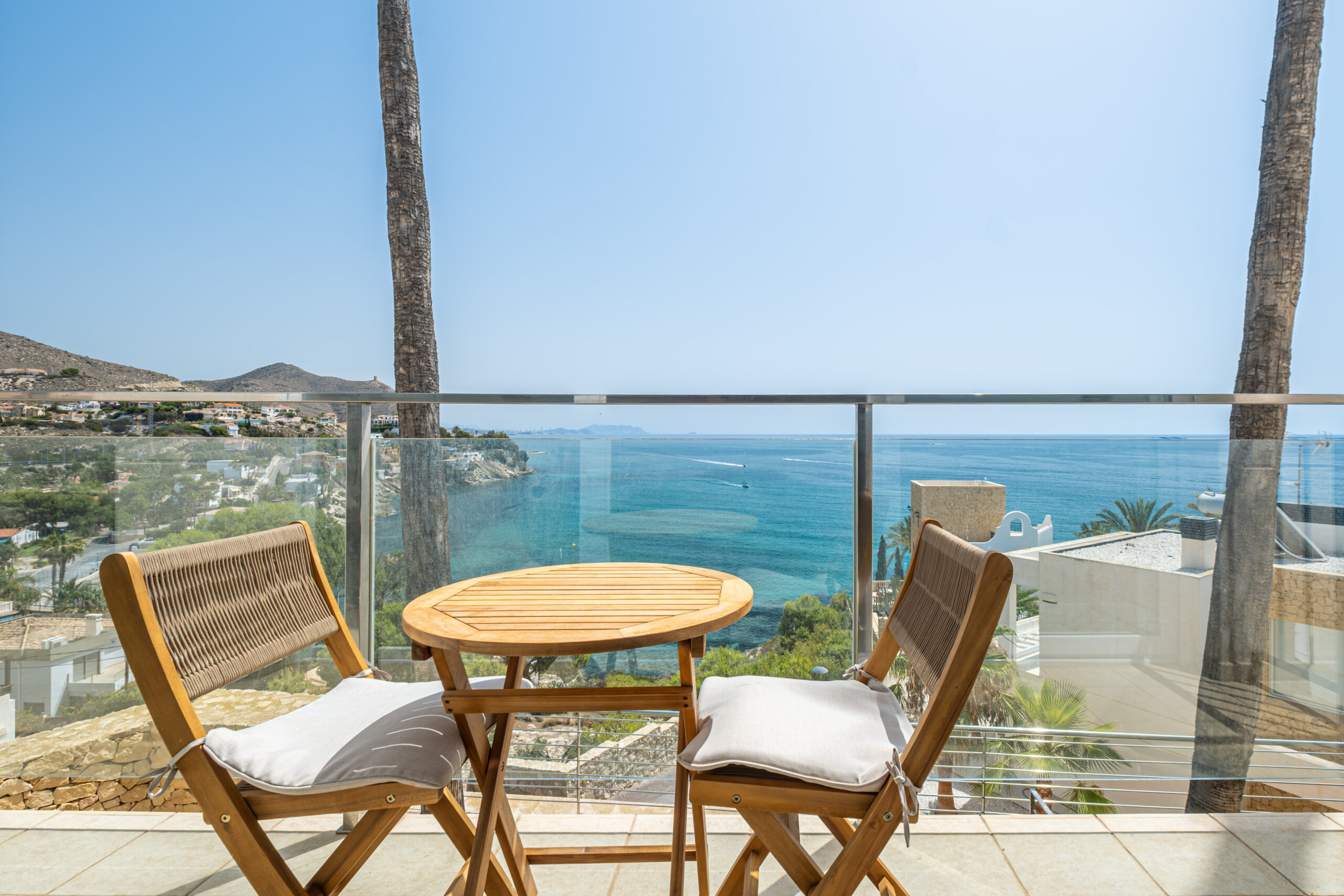 1. Balcon privado con vista al mar: Está equipado con una mesa y dos sillas para que te relájate con hermosas vistas al mar y las montañas.